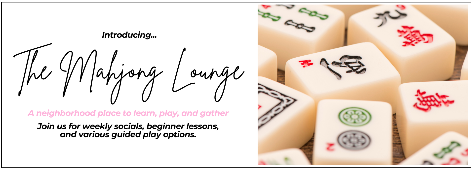 Join us for two-hour open play under the guidance of an instructor during play in our new Mahjong Lounge! Guided social play is for experienced beginners who would be more comfortable with an instructor present. Meet other Mahjong players who are at the same level and excited to gain more experience! Light bites, tea, lemonade included. Max 16. $20